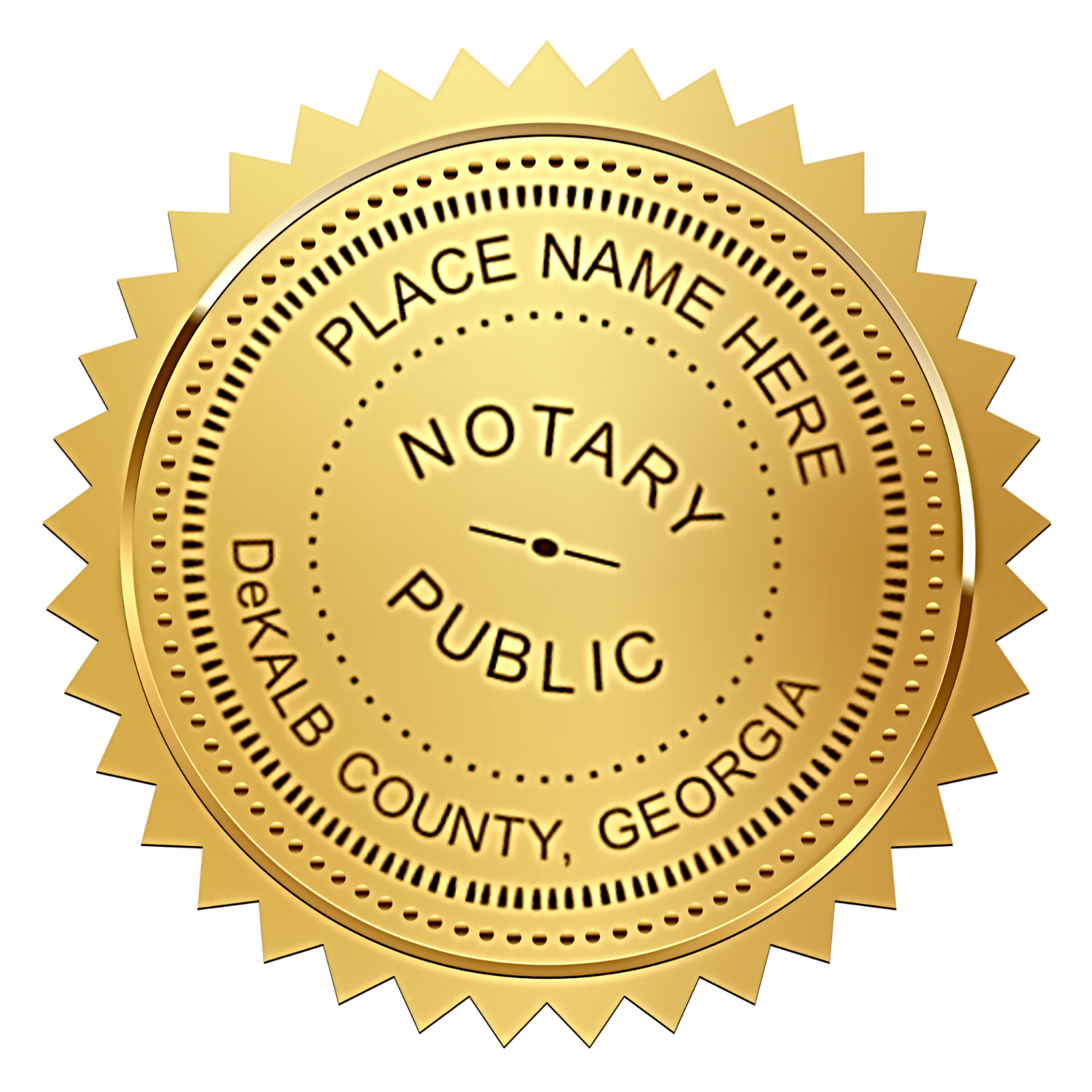 Each notary must provide a seal of office for the authentication of notorial acts. The seal must contain the name of the notary and the name of the county in which the commission was receieved. Example: John Doe, Notary Public, DeKalb County GA.